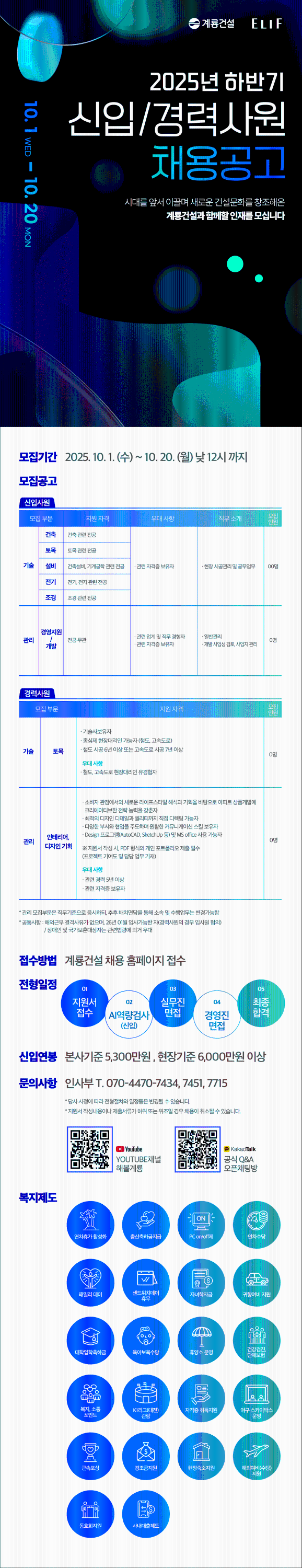 | 제목 | [계룡건설] 2025년 하반기 신입/경력사원 채용 <~2025. 10. 20.(월)> | 날짜 | 2025-10-02 | 조회수 | 737 | |